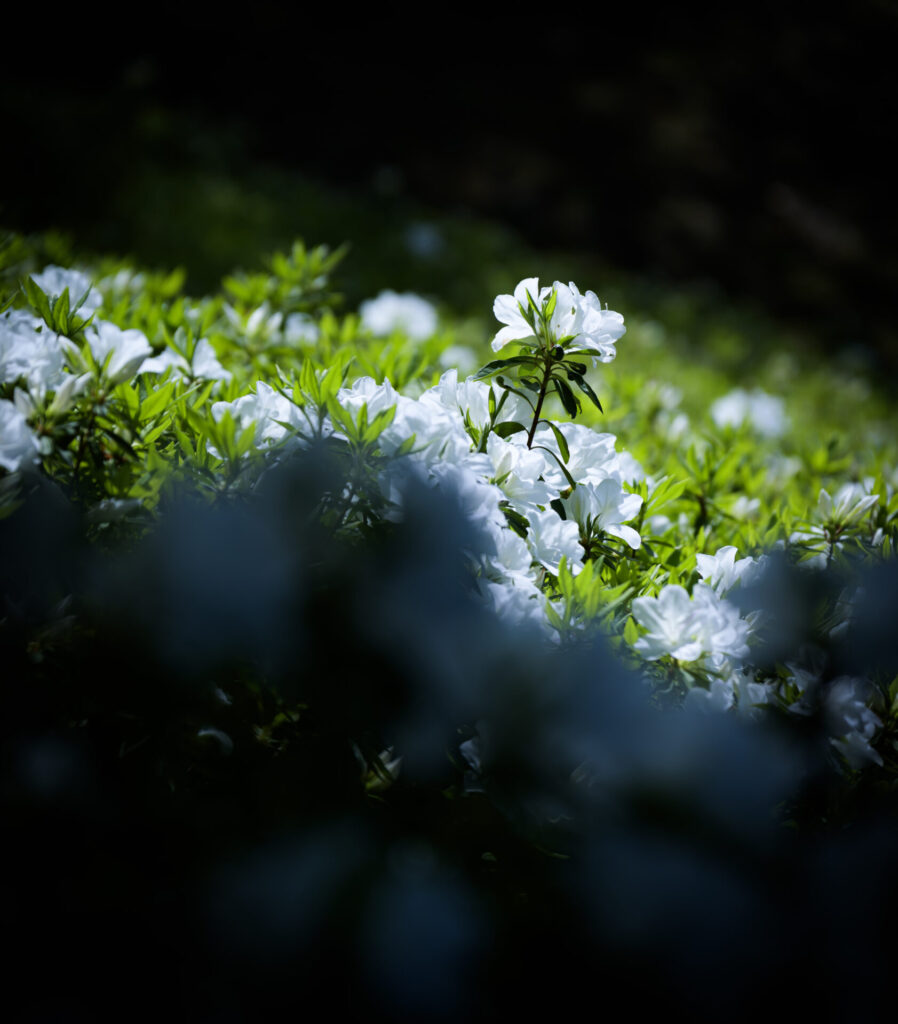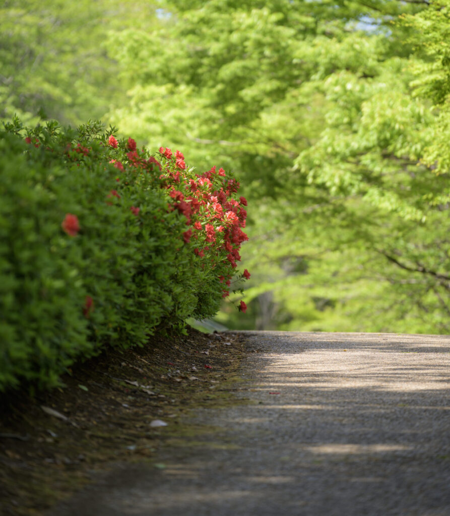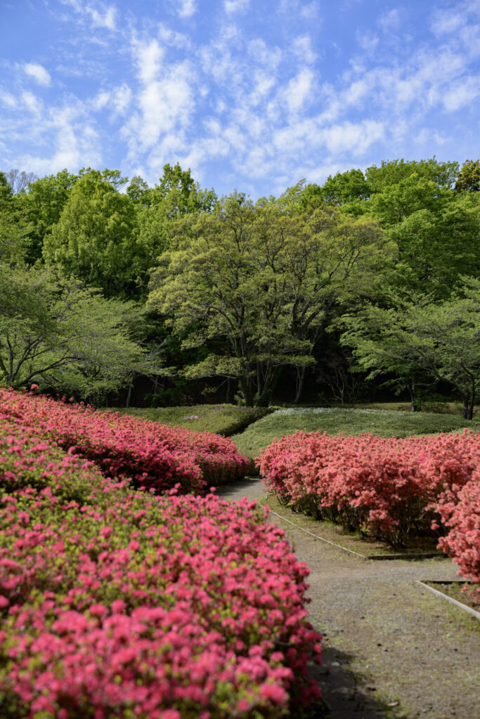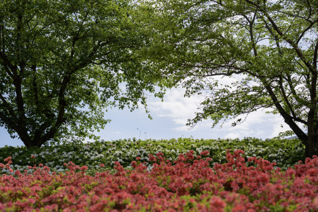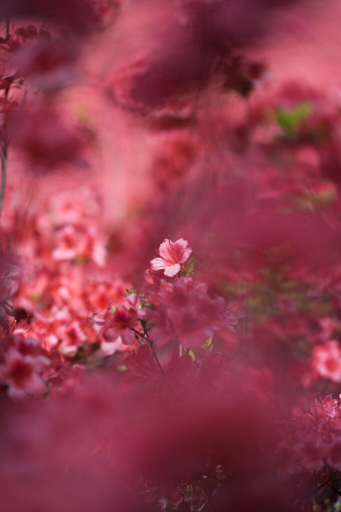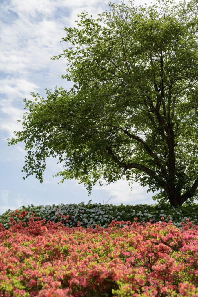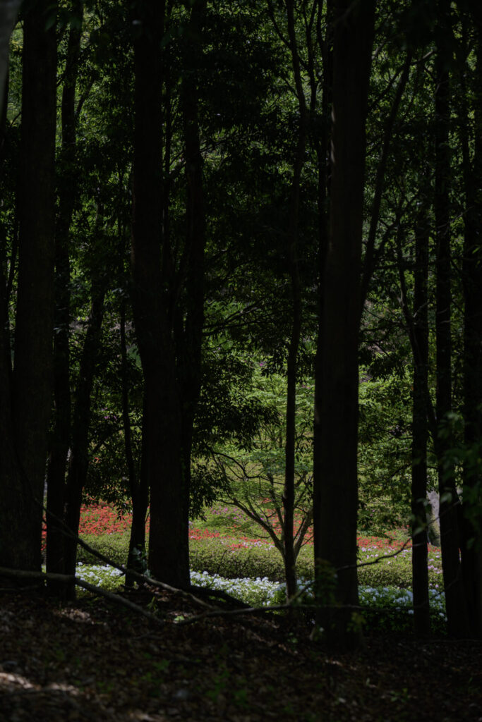 木のシルエットを活かして、その奥に見える赤いつつじを強調してみるもの面白い。