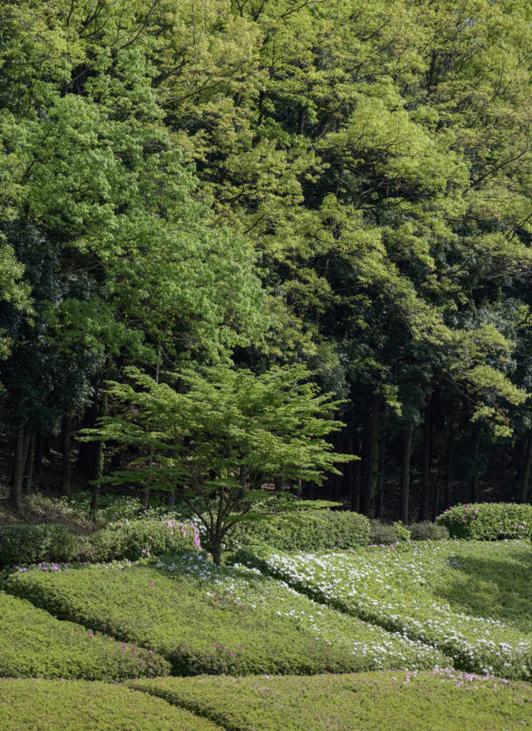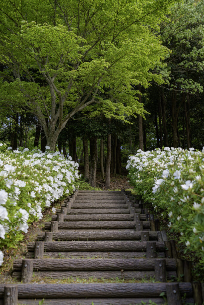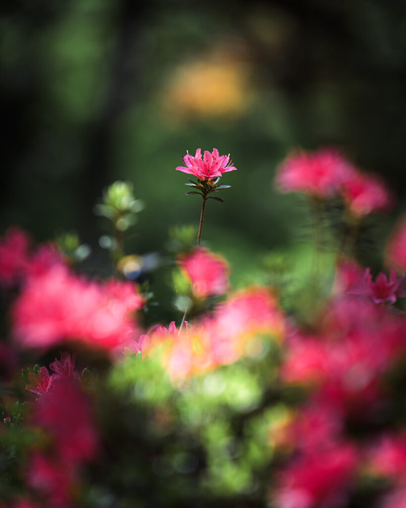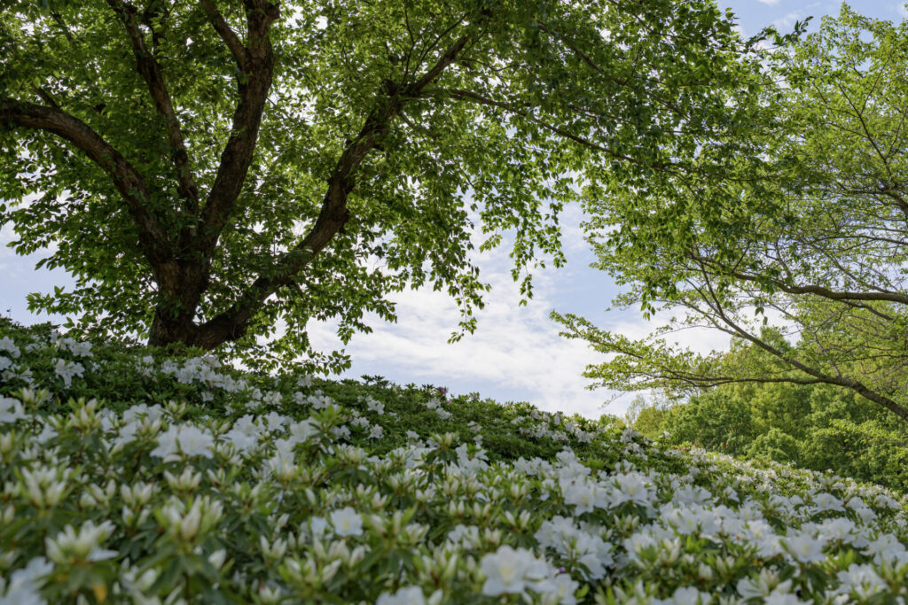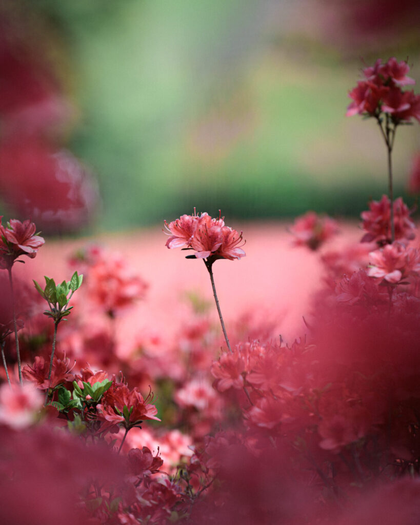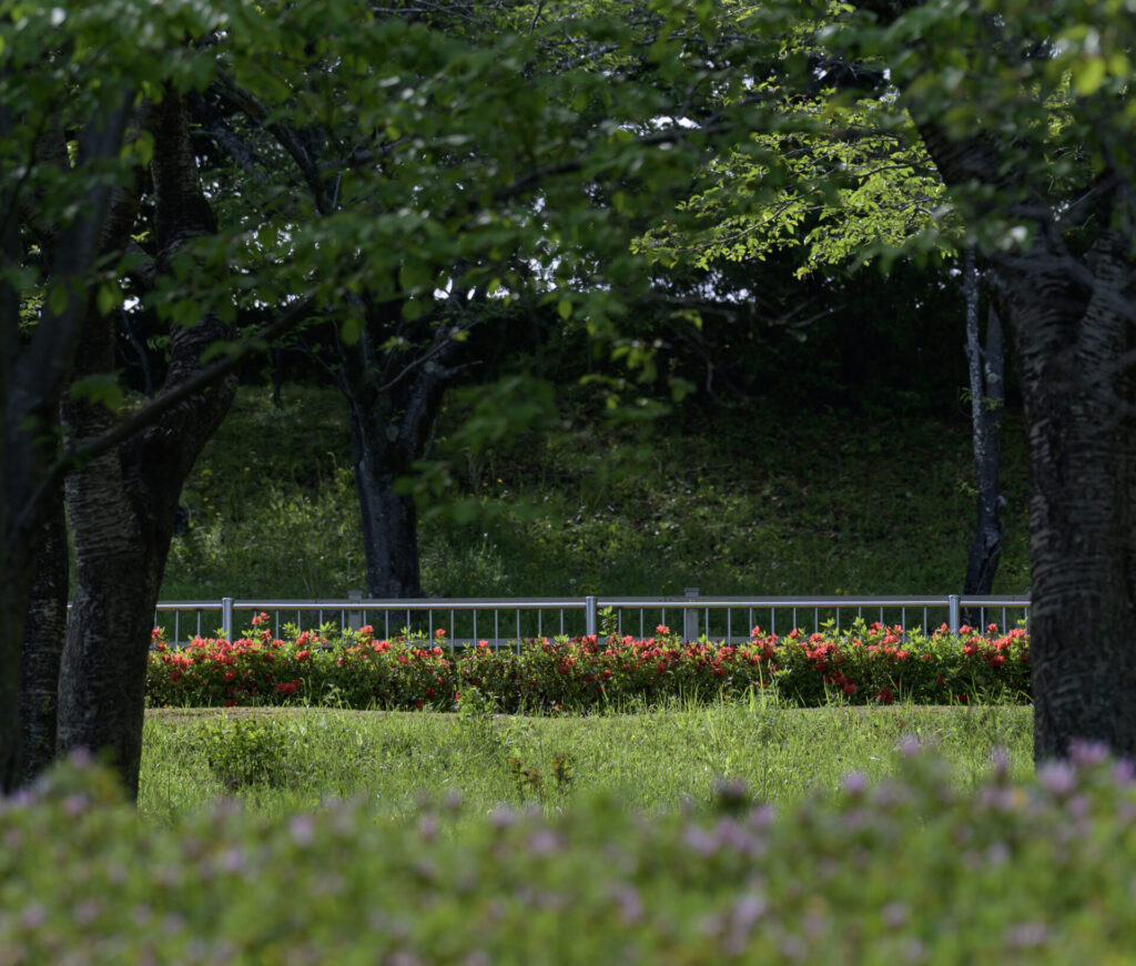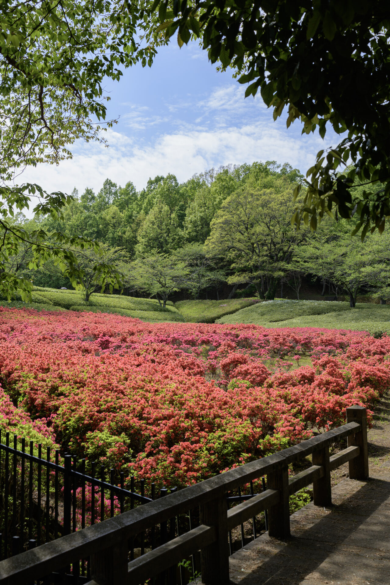 木のシルエットを活かして、その奥に見える赤いつつじを強調してみるもの面白い。