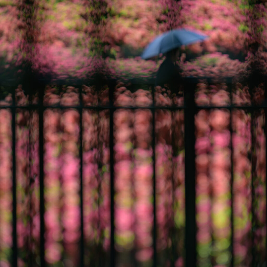 柵から見えるつつじと傘をさす人をボカしてみた一枚。これはこれでいい雰囲気