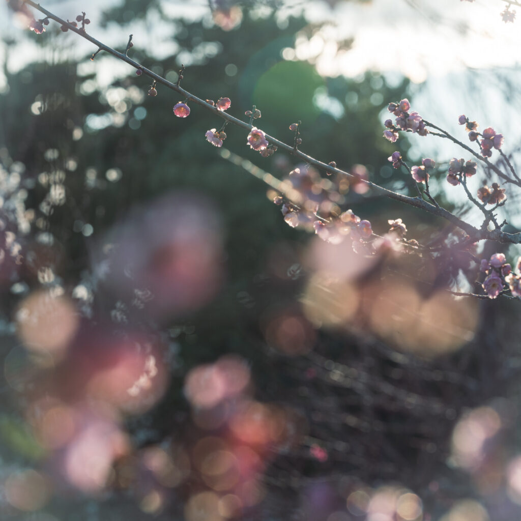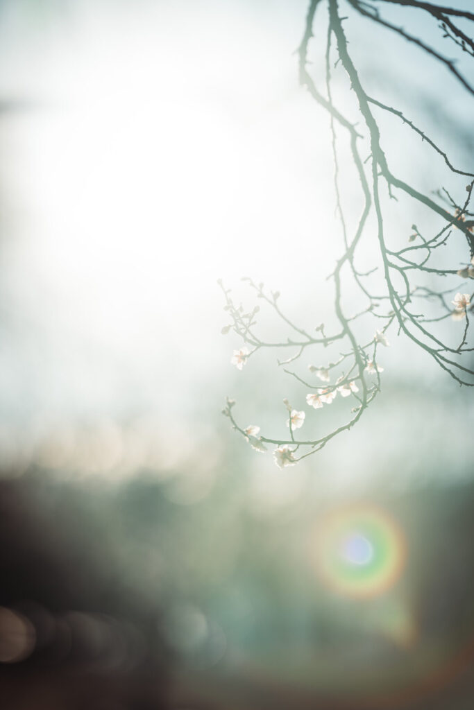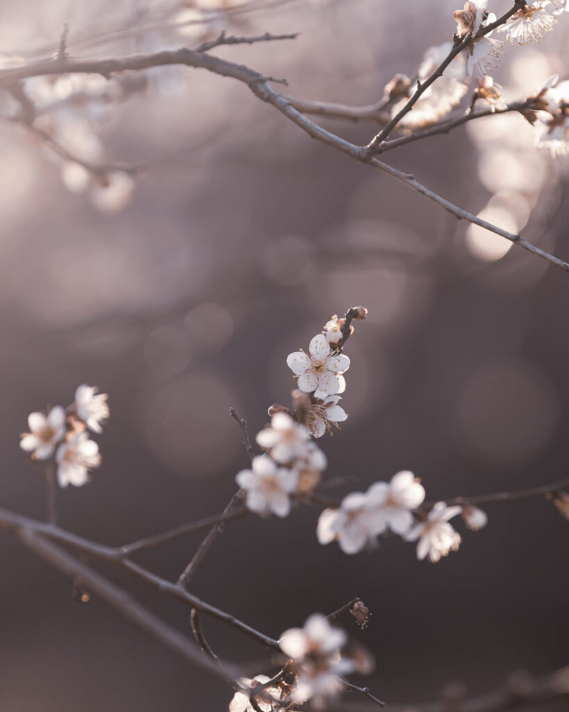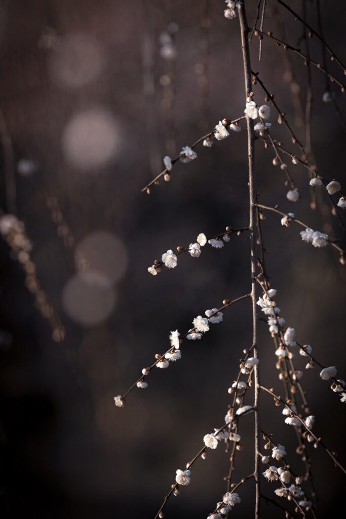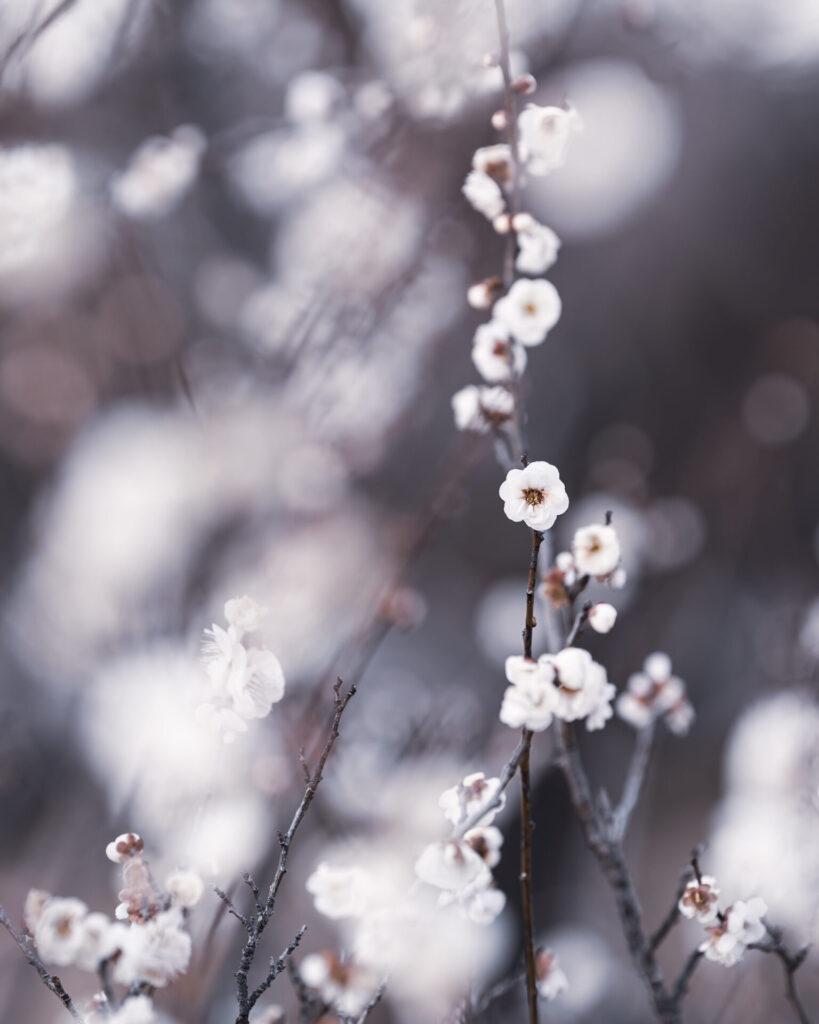 小さい花が枝に無数に咲く梅は玉ボケを表現するのにすごくいい。白い花はまるで雪のようにも見えます