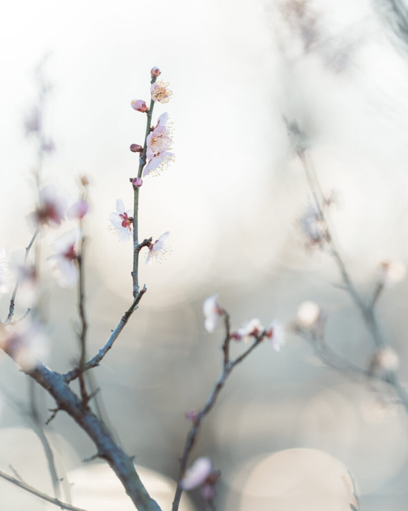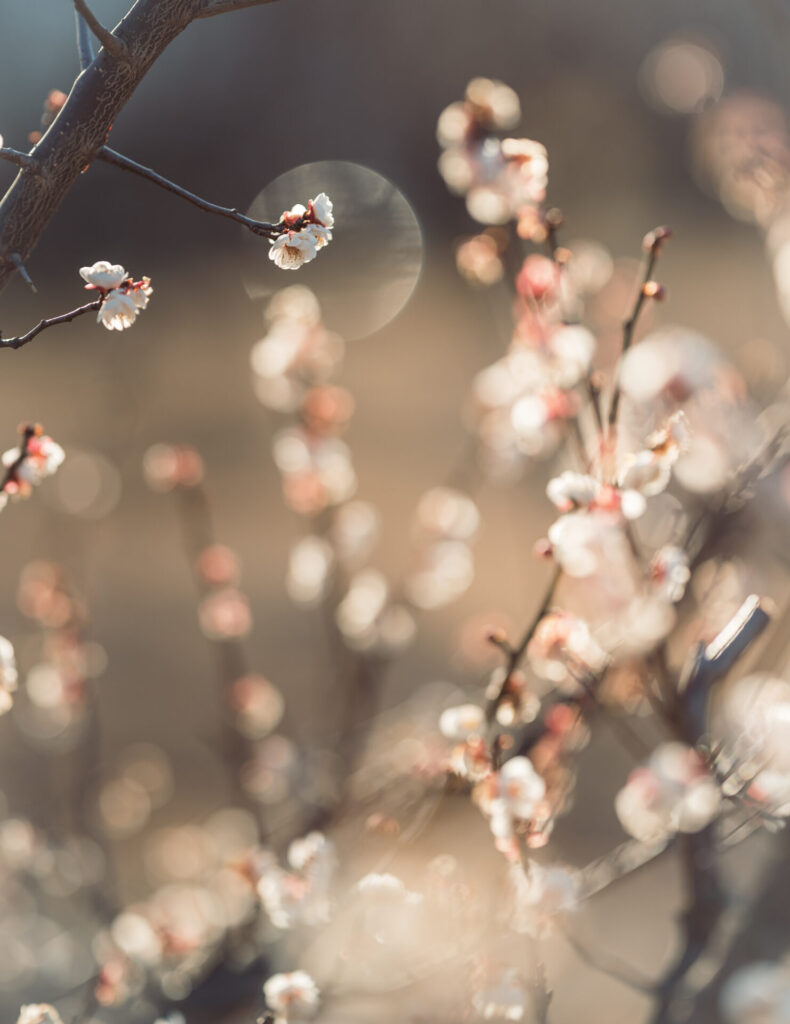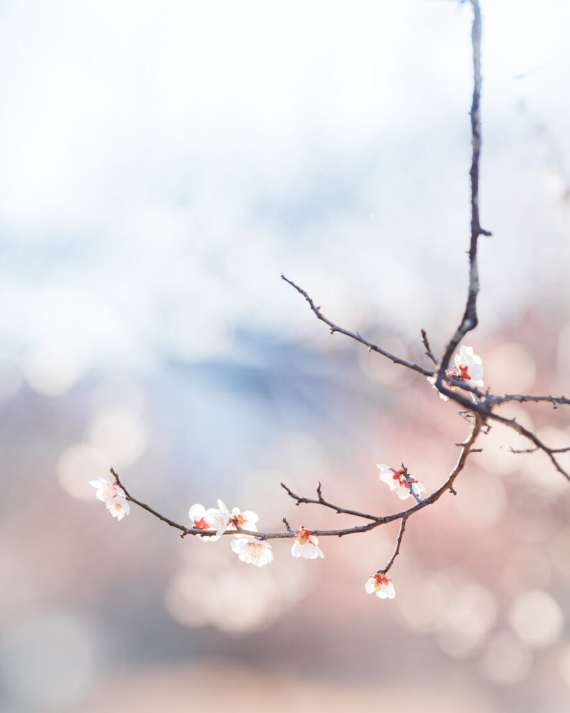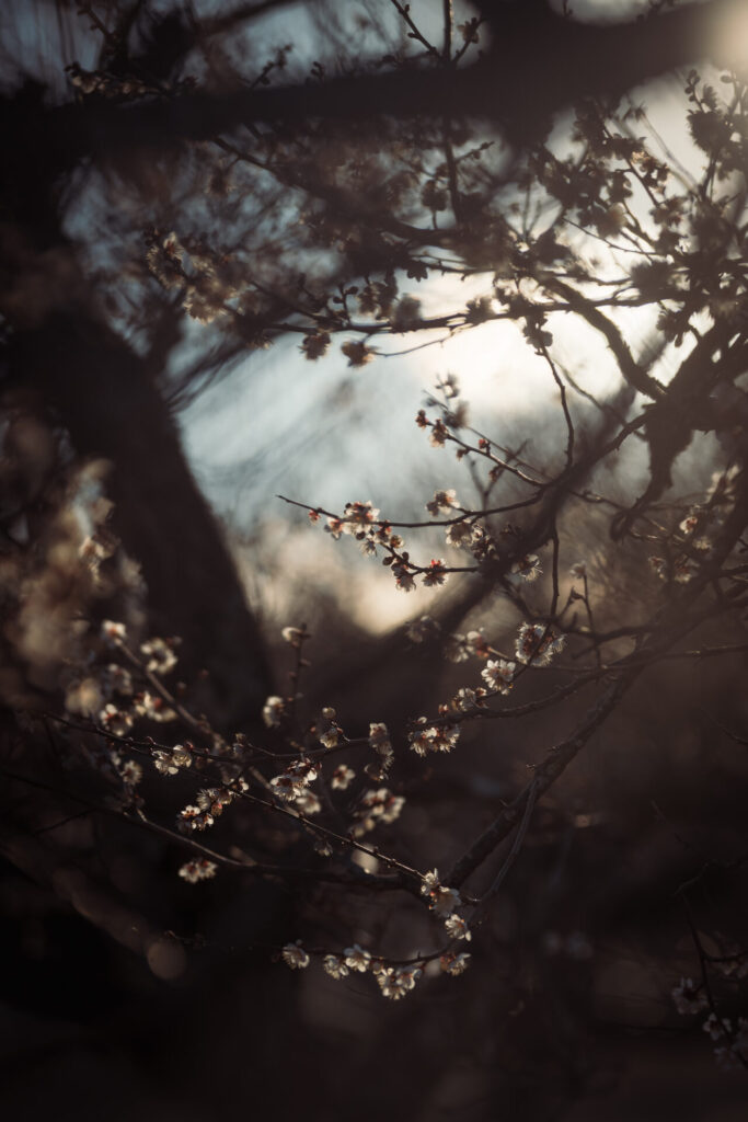 小さい花が枝に無数に咲く梅は玉ボケを表現するのにすごくいい。白い花はまるで雪のようにも見えます