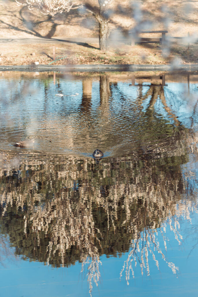 水面に映る梅の木を泳ぐ鴨