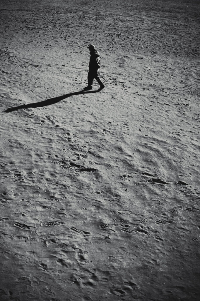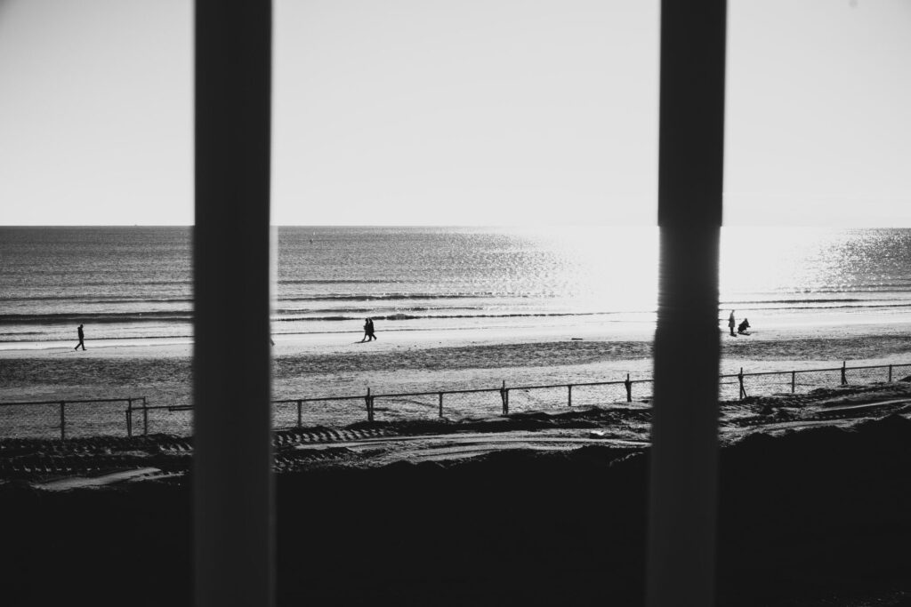 鎌倉の海にも寄り道。海なのにモノクロ。光が強く色が綺麗に出るのを通り越して眩しすぎる。と感じましたのでモノクロで撮りました。最後は手すりの隙間から海岸を眺めて、人が小さく画面が3等分されたこの構図が気に入っています。